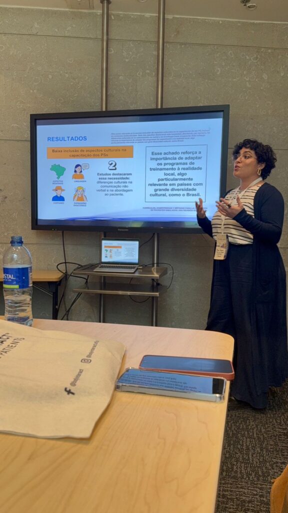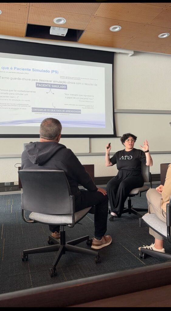 Além disso, Karen Estevam apresentou seu trabalho acadêmico: “Currículos, competências e métodos para treinamento de pacientes simulados: uma revisão sistemática”, ampliando a visibilidade internacional das pesquisas desenvolvidas no Brasil.