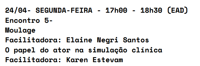 Karen Estevam falará sobre o papel do ator na simulação clínica no dia 24/04/2023, às 18h, após a aula de Moulage da Facilitadora Elaine Negri Santos, conforme cronograma de aula do dia:
