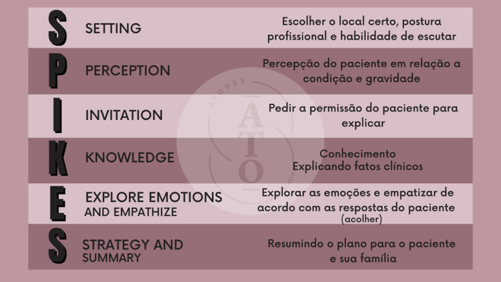 7. Método SPIKES: é um roteiro que descreve as partes principais de uma conversa envolvendo a entrega de notícias difíceis. Trata-se de um protocolo ou método de divulgação de más notícias representado pela sigla SPIKES, uma abordagem que compreende as seguintes seis etapas: